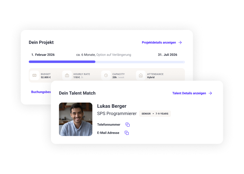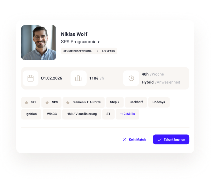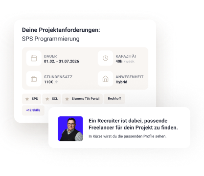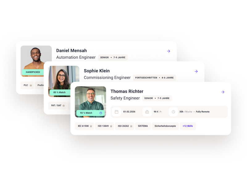 Wir matchen deinen Bedarf mit geprüften Engineering-Experten in weniger als 48 Stunden - klar strukturiert nach Rollen und Skills und komplett kostenlos.